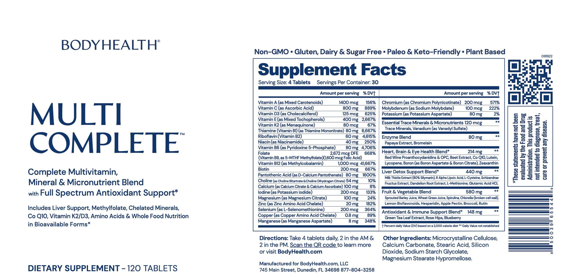 Multi Complete is a broad-spectrum multivitamin made from a blend of organic fruit and vegetable concentrates, essential vitamins, minerals, and key nutrients. This daily-use formula includes methylated B vitamins, chelated minerals, CoQ10, and vitamins K2 and D3.
